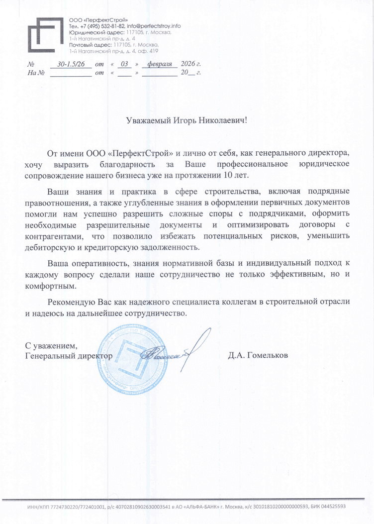 В должности руководителя юридического отдела управляющей организации в период 2022–2024 гг. удалось значительно увеличить сбор платежей за жилищно-коммунальные услуги в многоквартирных домах, находящихся в эксплуатации в управляющей компании. Лучший показатель по эффективности в ЦАО Москвы.